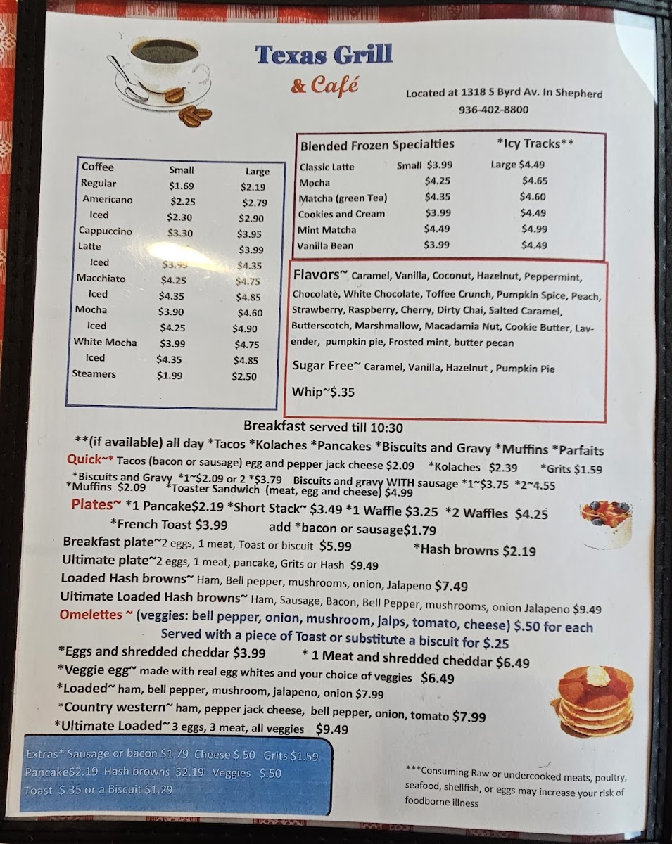 Welcome to Texas Grill and Cafe, a hidden gem located at 1318 S Byrd Ave, Shepherd, TX. Known for its hearty and flavorful offerings, the menu presents a delightful fusion of traditional Texas favorites and Tex-Mex twists.
